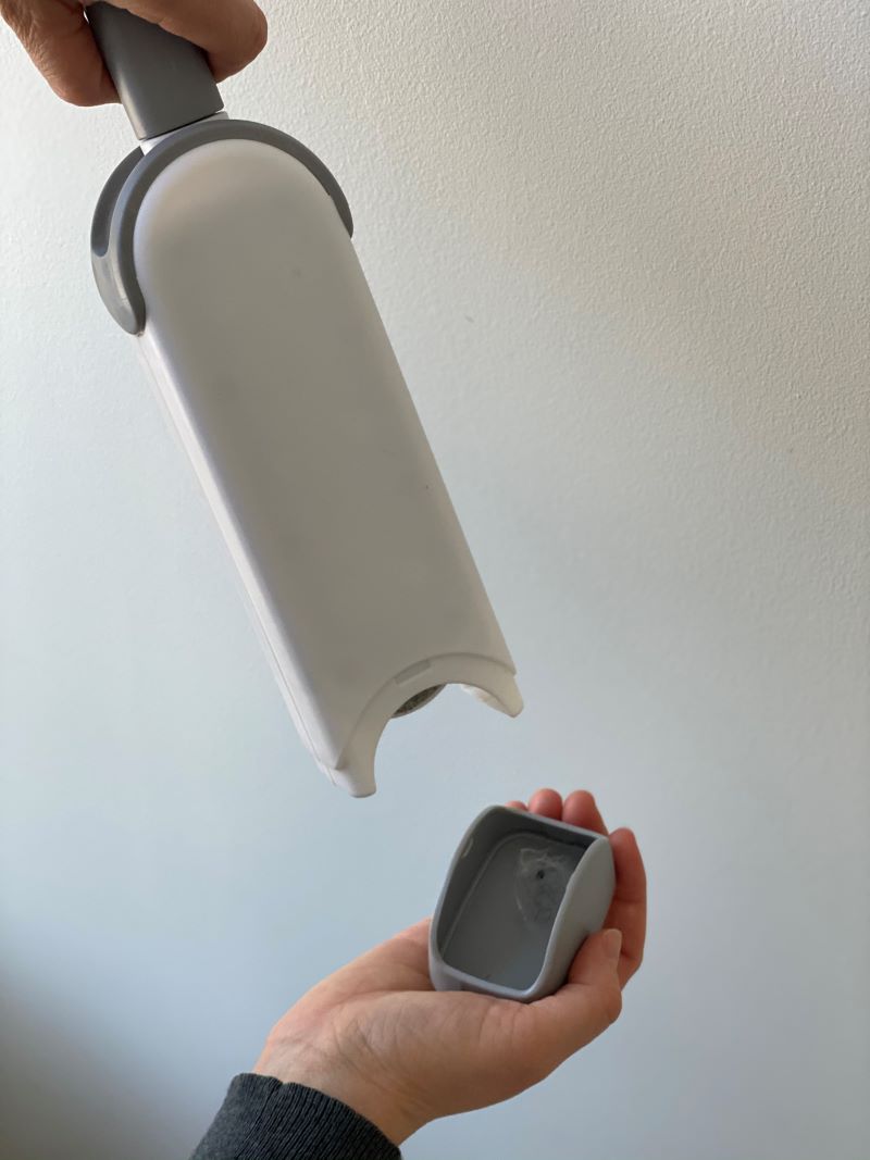 Laitteen takana on luukku karvoja varten. Kun olet harjannut sohvan tai vaatteet, kaikki irtoaines on säiliön sisällä. Avaat vain luukun ja kippaat karvat roskikseen – kätesi pysyvät puhtaana eikä sinun tarvitse koskea likaan.