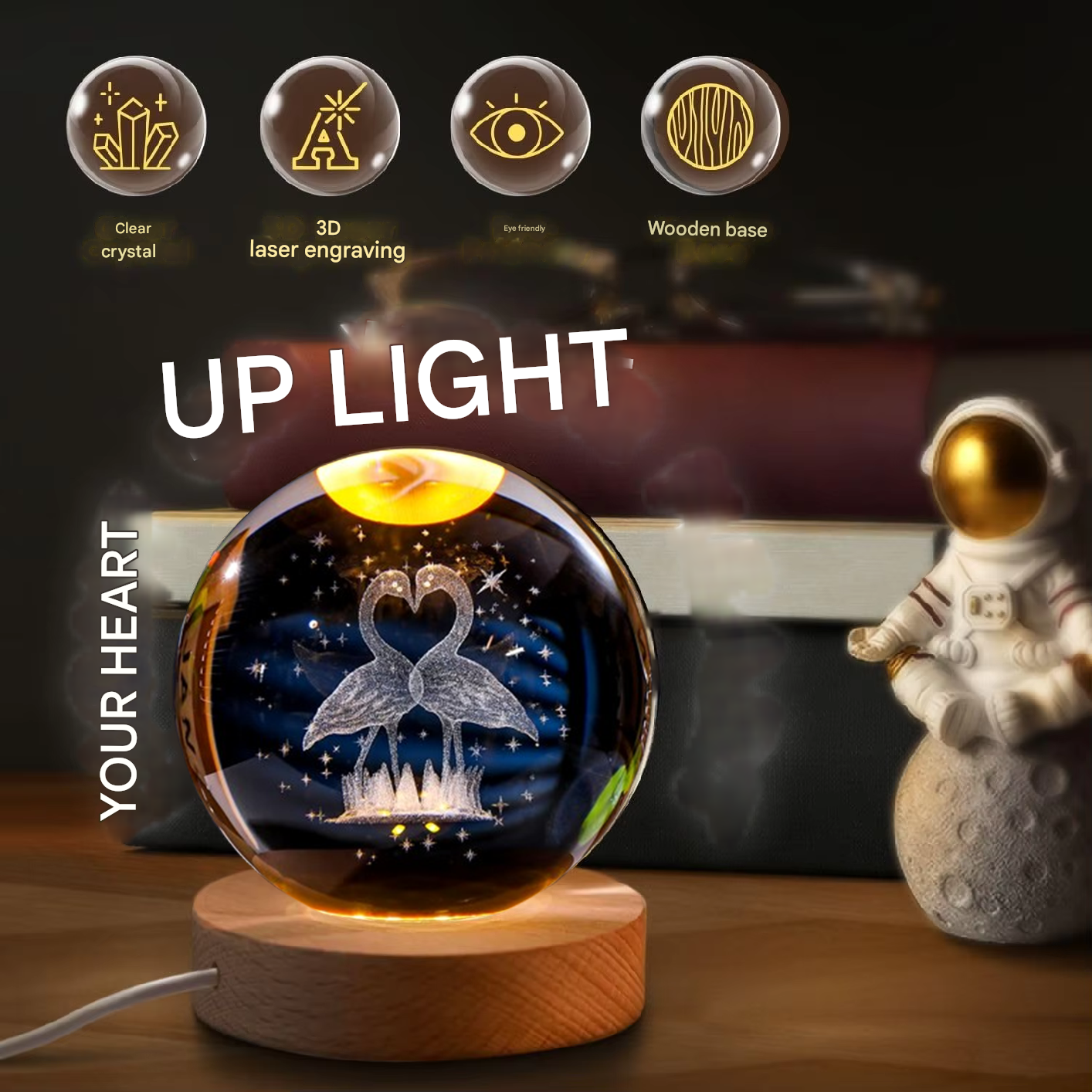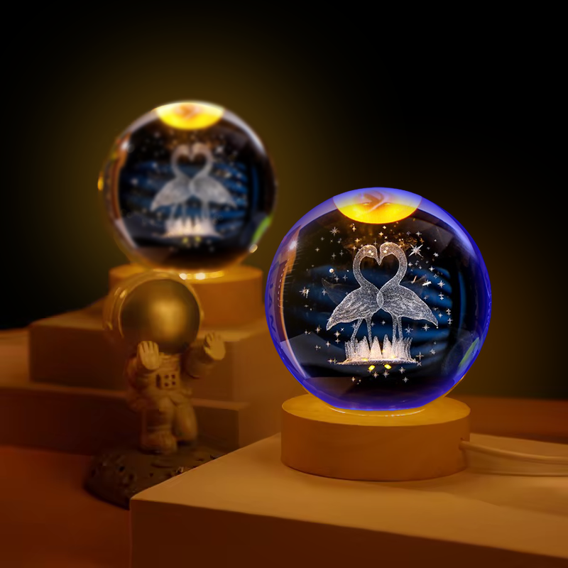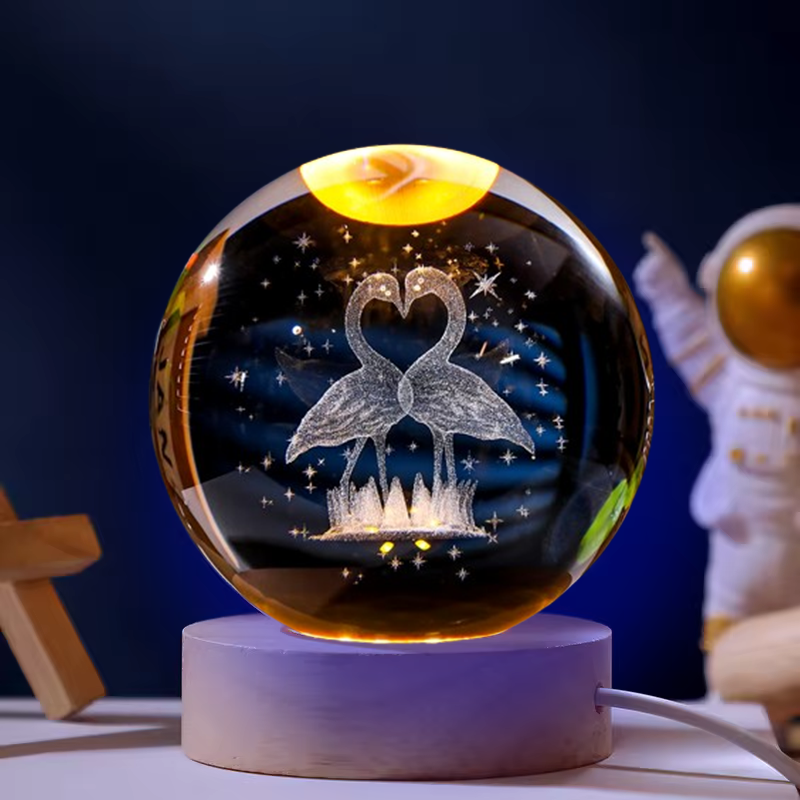 Tässä kristalli valaisin -tuotteessa kaksi ankkaa kelluvat yhdessä tähtien ja planeettojen keskellä. Valo luo rauhallisen, pehmeän hehkun huoneeseen.