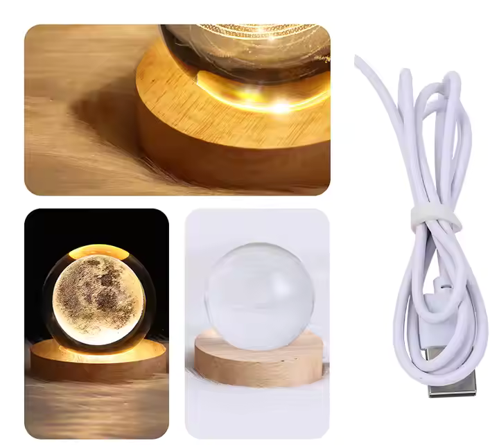 Kristallipallo on tehty aidosta K9-lasista. Kun valo syttyy, ankat ja aurinkokunta näkyvät kauniina. Jalusta on puuta, ja se pitää lampun tukevasti paikallaan.