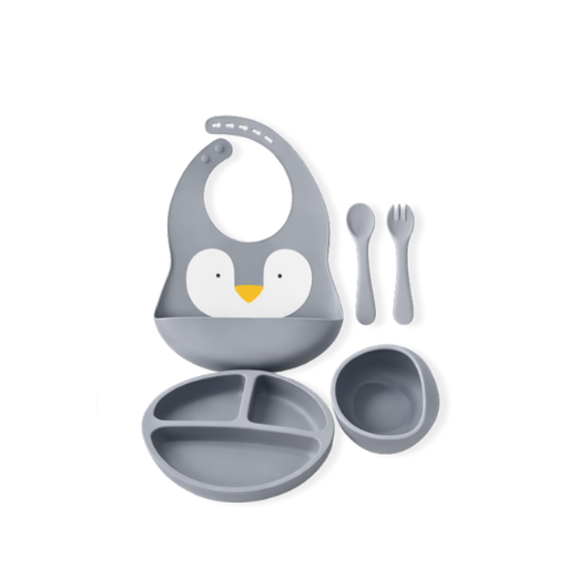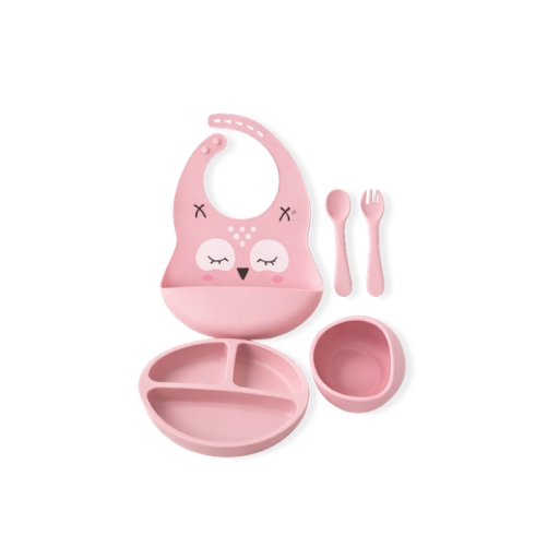 - Tämä 5-osainen silikonisetti sisältää ruokalapun, lautasen, kulhon, haarukan ja lusikan – kaikki mitä vauva tarvitsee ruokailuun.
