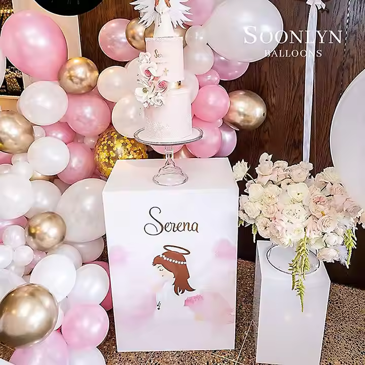 Pehmeät, kauniit värit – Valkoinen, vaaleanpunainen ja kulta. Näyttää tyylikkäältä, ei lasten juhlilta.