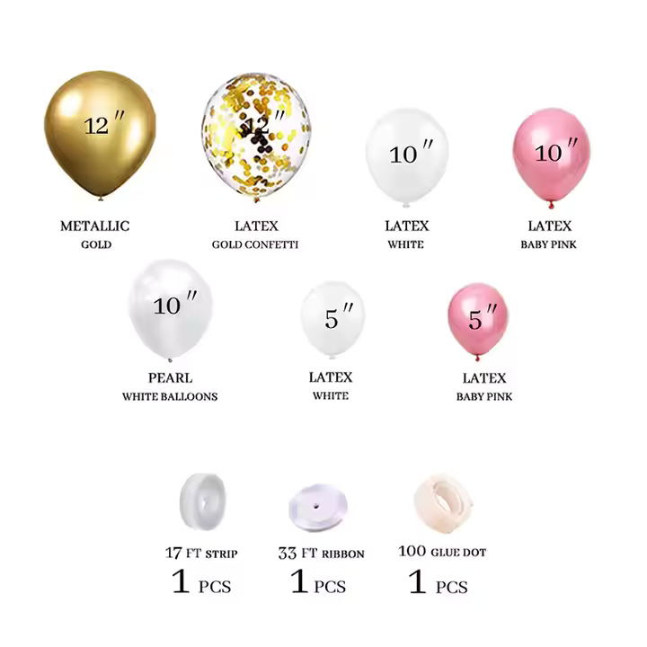 • Isoja, keskikokoisia ja pieniä ilmapalloja (valkoinen, vaaleanpunainen, kulta)